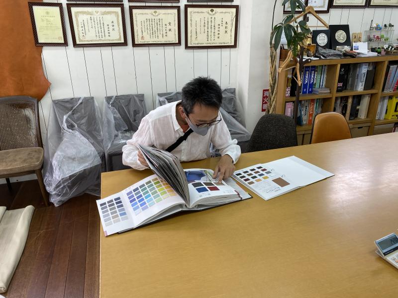 清水様とは6月末に弊社HPの御見積りフォームからお問い合わせがあり、何度かメールでやり取りをさせていただき7月某日椅子の持ち込みと生地の選定で御来社していただきました。