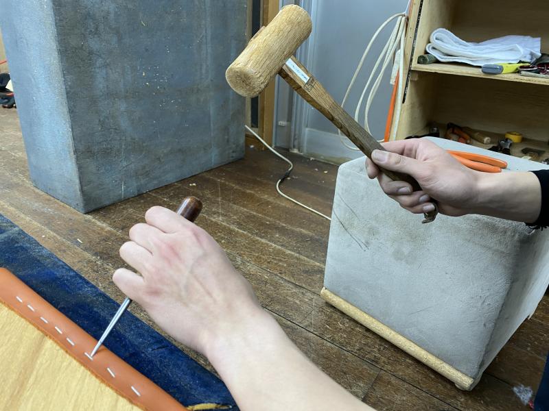 「かき出し」の柄部分を木ハンマーでたたきます。